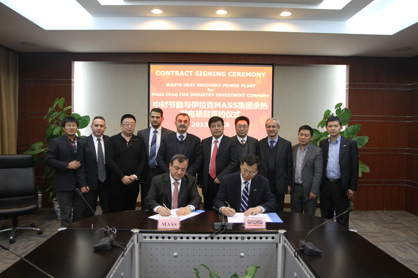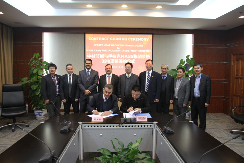 2013年12月18日,中材節(jié)能與伊拉克MASS工業(yè)投資集團(MASS Iraq for Industry Investment Company)在昆山成功簽署了伊拉克首個水泥窯余熱發(fā)電項目總承包合同。這是中材節(jié)能繼在承接沙特、阿聯(lián)酋水泥窯余熱發(fā)電總承包工程之后,在中東市場上獲得的又一重要訂單。該項目是利用伊拉克MASS集團旗下的SCP水泥廠3條日產5000噸水泥生產線建設的余熱發(fā)電項目,該項目總裝機規(guī)模為25MW。